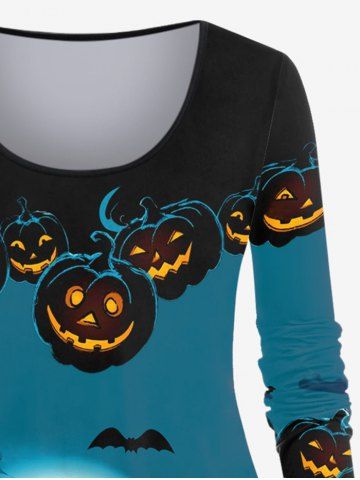 Plus Size Halloween Colorblock Pumpkin Bat Moon Print T-shirt - Blue - 2x