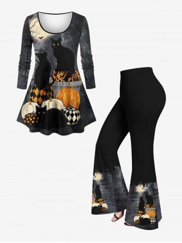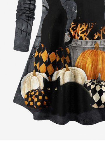 Plus Size Halloween Costume Cat Pumpkin Tree Moon Bat Print T-shirt - Black - 2x