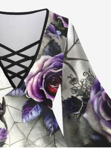 Halloween Tops > Plus Size Halloween Costume Rose Flower Leaf Spider Web Print Crisscross Lattice Flare Sleeve T-shirt