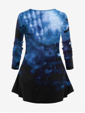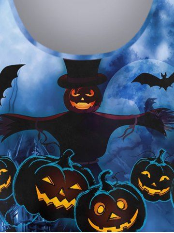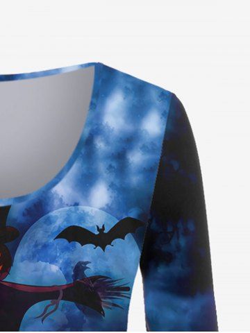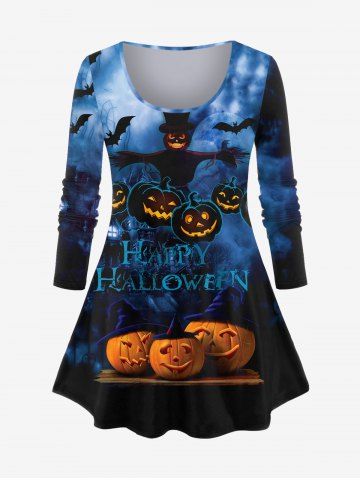Plus Size Halloween Pumpkin Bat Ombre Scarecrow Print T-shirt - Deep Blue - 2x