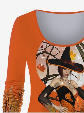 Plus Size Halloween Pumpkin Tree Hat Witch Broom Print T-shirt - Orange - 4x