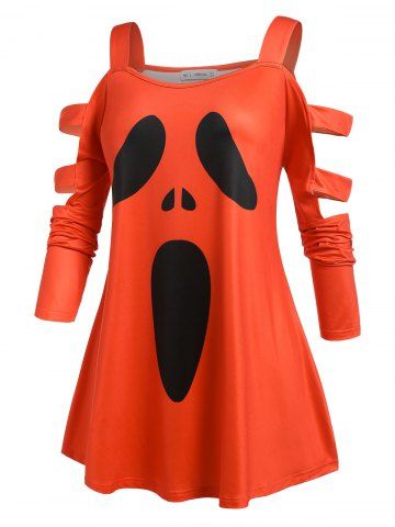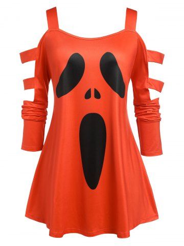 d*****b5Halloween Cutout Skull Pattern Cinched Ruched Colorblock Twofer TeeColor: BLACK Size: 2X | US 18-20love the jumper top non detachable orange top inside, soft and comfy ideal for lounge day or dressing up for Halloween