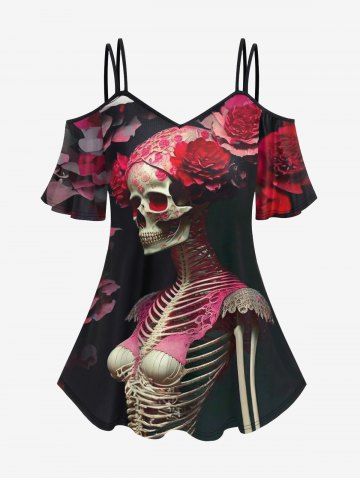 Plus Size Skeleton Floral Print Cold Shoulder Halloween Cami T-shirt - Red - 4x