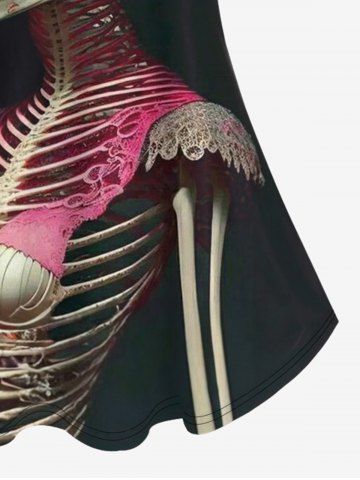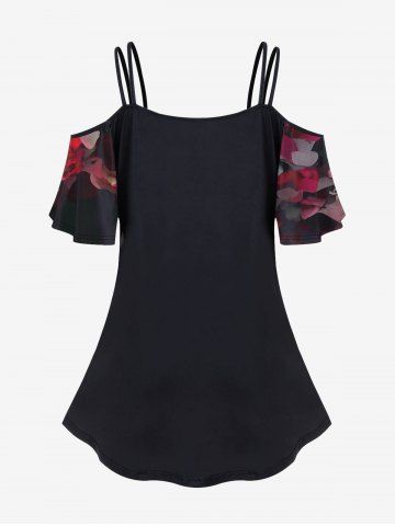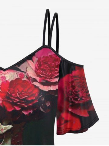 Plus Size Skeleton Floral Print Cold Shoulder Halloween Cami T-shirt - Red - 5x