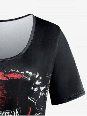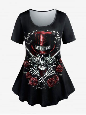 Halloween Plus Size Skull Hat Gun Rose Print T-shirt - Black - 4x