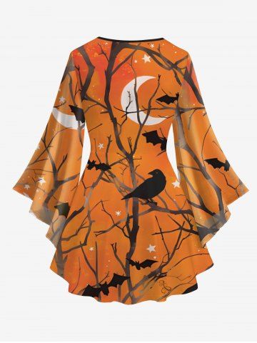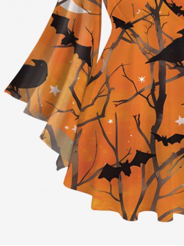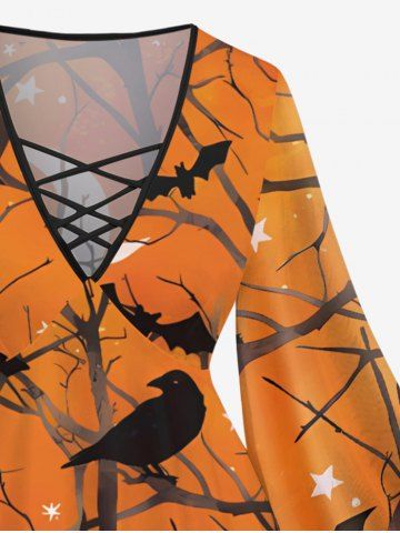 Plus Size Tree Branch Crow Bat Moon Sat Galaxy Print Halloween Lattice T-shirt - Dark Orange - 1x