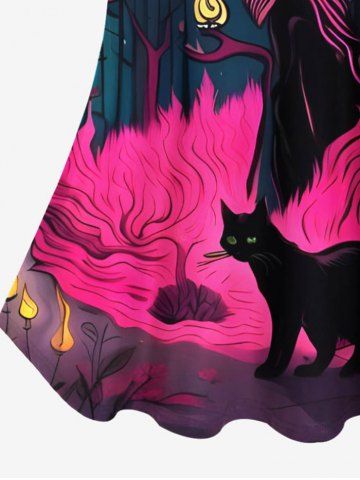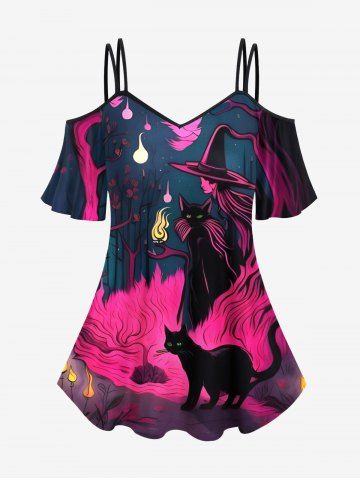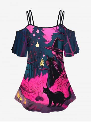 Plus Size Wizard Cat Tree Fire Flame Print Halloween Cold Shoulder Cami T-shirt - Black - 1x