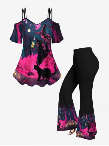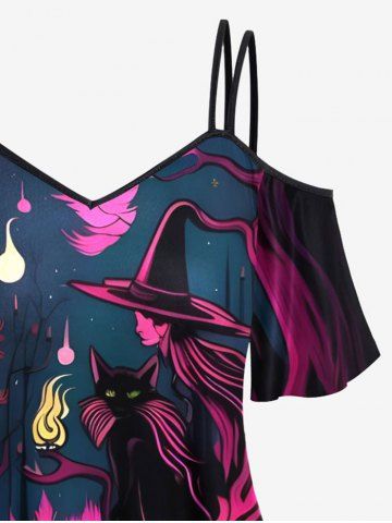 Plus Size Wizard Cat Tree Fire Flame Print Halloween Cold Shoulder Cami T-shirt - Black - 2x