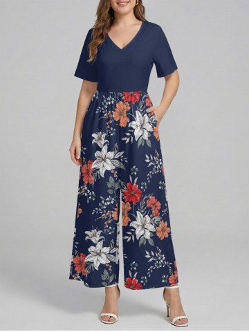 Flower Leaf Branch Print Hawaii Wide Leg Jumpsuit - Navy Blue - M