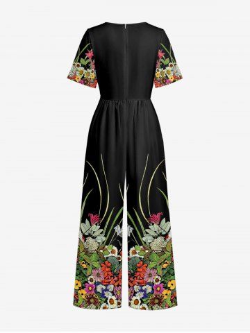 Flower Leaf Plant Print Hawaii Wide Leg Jumpsuit - Black - Xs