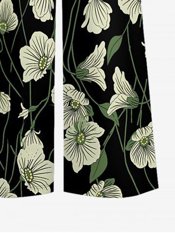 Flower Leaf Print V Neck Hawaii Wide Leg Jumpsuit - Black - Xs