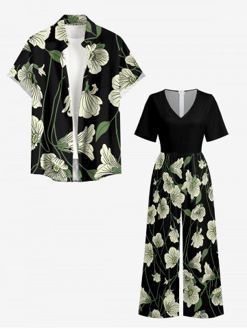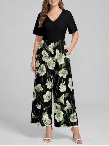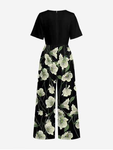 Flower Leaf Print V Neck Hawaii Wide Leg Jumpsuit - Black - M