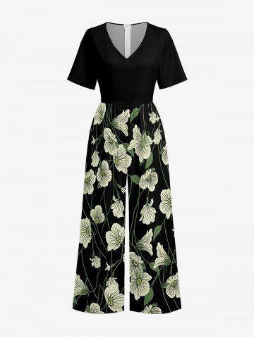 Flower Leaf Print V Neck Hawaii Wide Leg Jumpsuit - Black - Xl