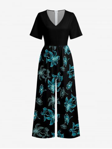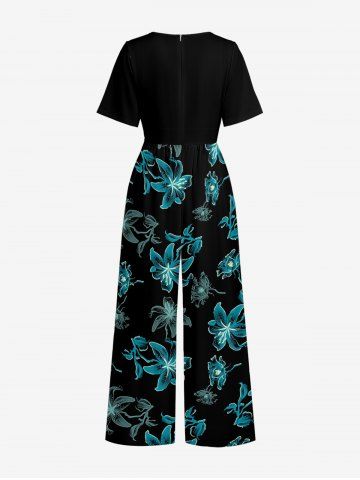 Flower Print Hawaii Wide Leg Jumpsuit - Dark Turquoise - L