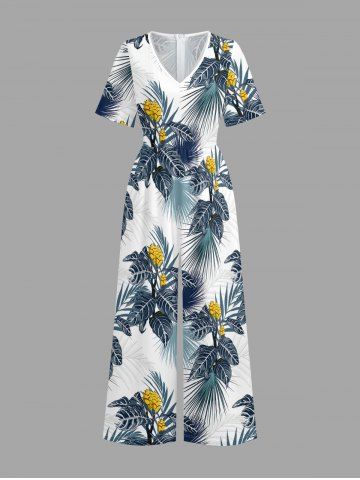 Flower Tropical Leaf Print V Neck Hawaii Wide Leg Jumpsuit - Deep Blue - 2xl