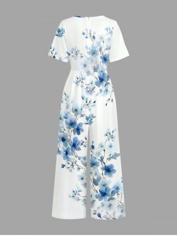 Flowers Branch Print V Neck Hawaii Wide Leg Jumpsuit - Light Blue - 2xl