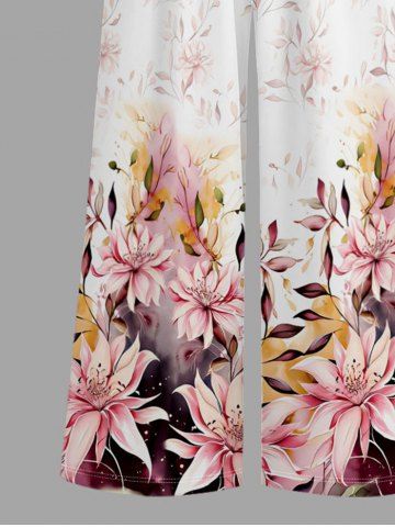Flowers Leaf Ombre Print V Neck Hawaii Wide Leg Jumpsuit - Pink - L