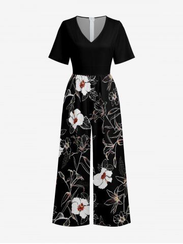 Hibiscus Flower Leaf Print V Neck Hawaii Wide Leg Jumpsuit - Black - S