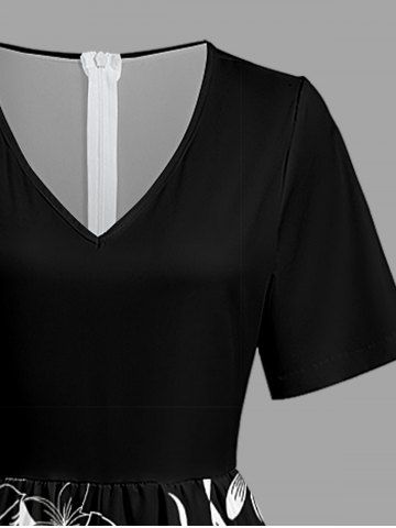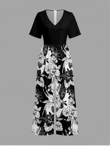 Hibiscus Flower Tropical Leaf Colorblock Print V Neck Hawaii Wide Leg Jumpsuit - Black - Xs