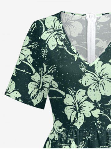 Hibiscus Flowers Leaf Print V Neck Hawaii Wide Leg Jumpsuit - Deep Green - 3xl