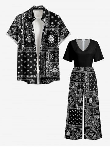 Paisley Floral Pattern Scarf Print V Neck Hawaii Wide Leg Jumpsuit - Black - M