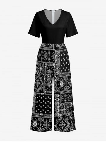 Paisley Floral Pattern Scarf Print V Neck Hawaii Wide Leg Jumpsuit - Black - L