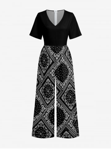 Plus Size Paisley Floral Scarf Print V Neck Hawaii Wide Leg Jumpsuit - Black - M