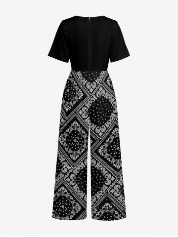 Plus Size Paisley Floral Scarf Print V Neck Hawaii Wide Leg Jumpsuit - Black - L