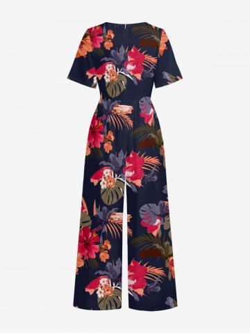 Tropical Leaf Hibiscus Flower Print Hawaii Pocket Wide Leg Jumpsuit - Navy Blue - M