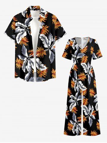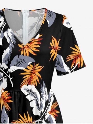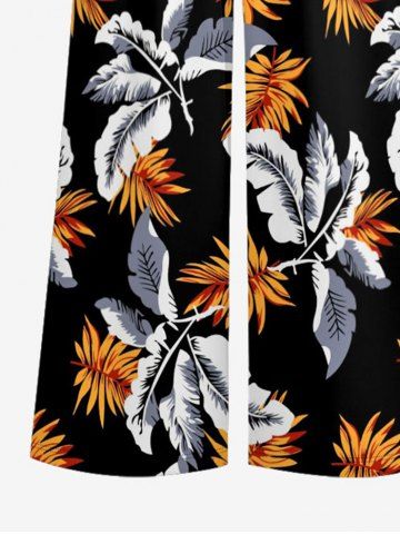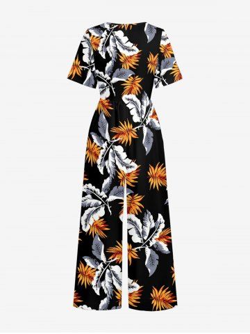 Tropical Leaf Print V Neck Hawaii Wide Leg Jumpsuit - Black - M