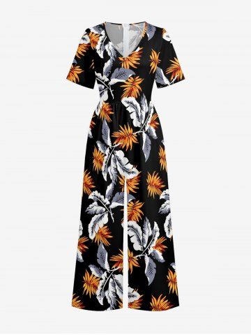 Tropical Leaf Print V Neck Hawaii Wide Leg Jumpsuit - Black - 2xl