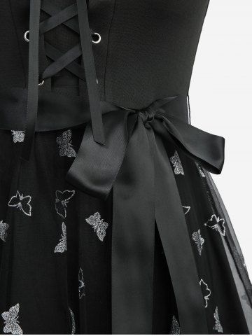 Glitter Silver Hot Stamping Butterfly Print Mesh Lace Up A Line Cami Dress with Removable Belt - Black - Xl