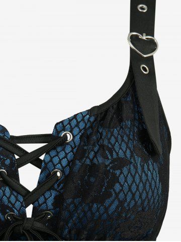 Rose Flowers Fishnet Lace Grommets Lace-up Heart Buckle Tank Dress - Black - M