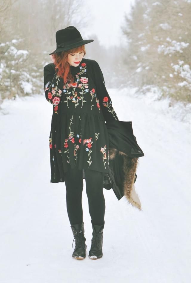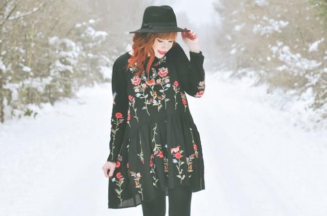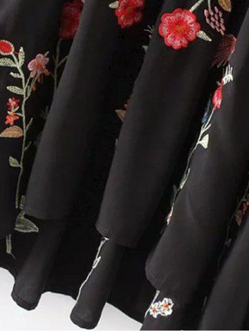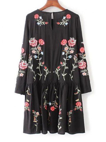 Floral Embroidered Smock Dress - Black - M