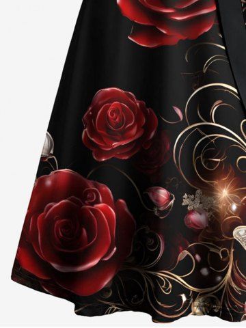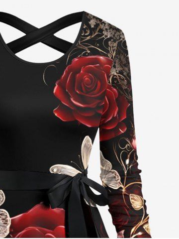 Long Sleeve Dresses > Plus Size Butterfly Rose Flower Glitter 3D Print Crisscross Hawaii Dress With A Belt