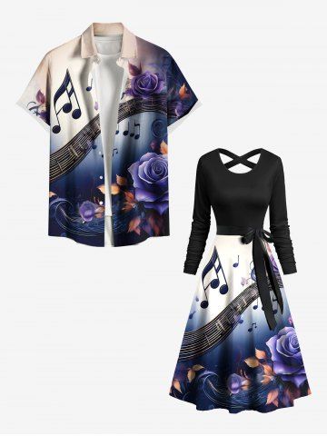 Rose Flower Leaf Music Symbol Print Ombre Crisscross A Line Dress with Tied Belt - Multi-a - S