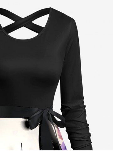 Long Sleeve Dresses > Rose Flower Leaf Music Symbol Print Ombre Crisscross A Line Dress with Tied Belt