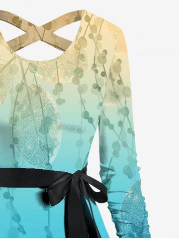 Rot Leaves Vine Branch Print Hawaii Ombre Crisscross A Line Dress with Tied Belt - Blue - Xl