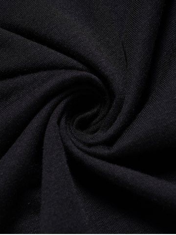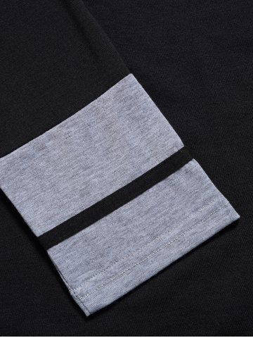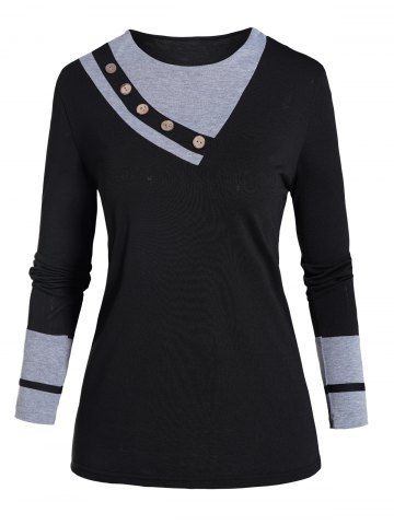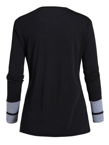 Contrast Colorblock Mock Button Round Neck Long Sleeve T Shirt - Black - M