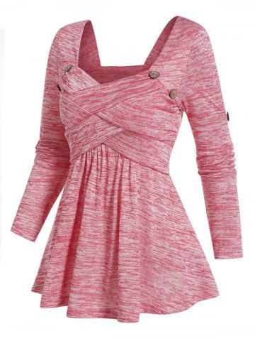 Crossover Sweetheart Neck Mock Button Long Sleeve Heathered Top - Light Pink - M