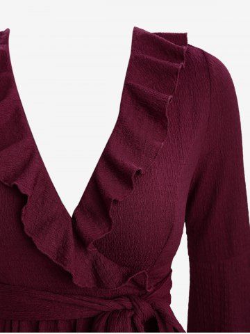 Floral Lace Patchwork Flare Sleeve Ruffles Top with Removable Belt - Deep Red - M