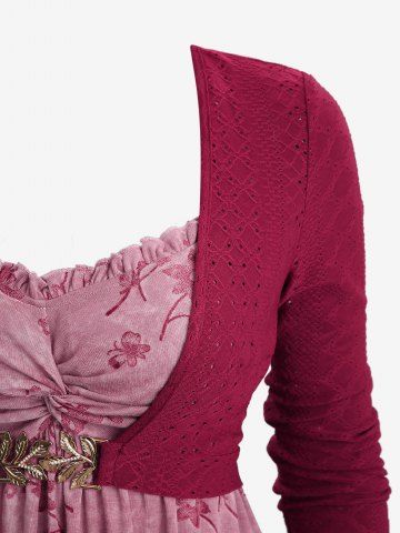 Flowers Butterfly Print Twist Ruffles Hollow Our Leaf Buckle 2 In 1 Long Sleeves Top - Deep Red - Xxl