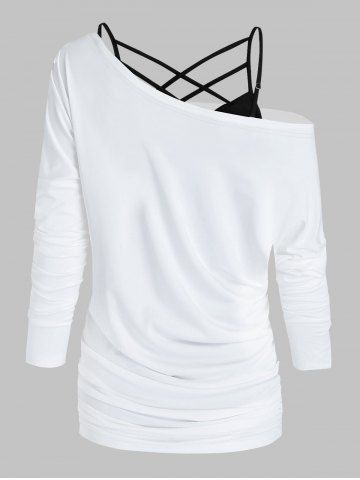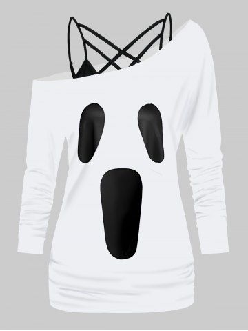 Halloween Ghost Face Print Skew Collar T-shirt And Lattice Camisole Set - White - S | Us 4