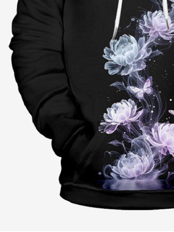 Plus Size Valentine's Day Rose Flowers Butterfly Print Pocket Drawstring Hoodie For Men - Black - 3xl