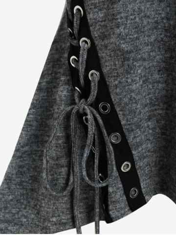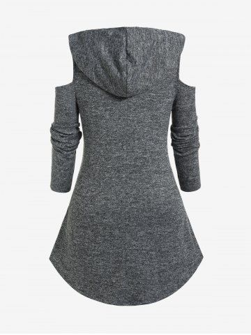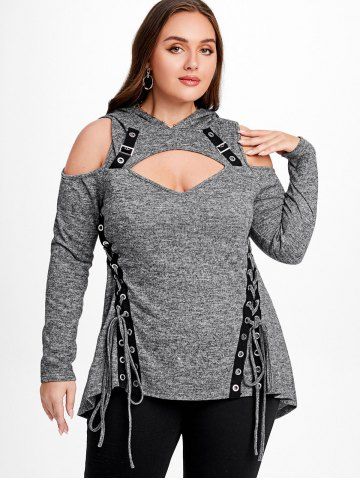 Gothic Cutout Lace-up Buckles Cold Shoulder High Low Hooded Tee - Gray - 3x | Us 22-24