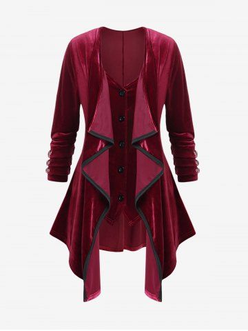 Gothic Draped Buckles Long Sleeves Velvet 2 in 1 Tee - Deep Red - 2x | Us 18-20