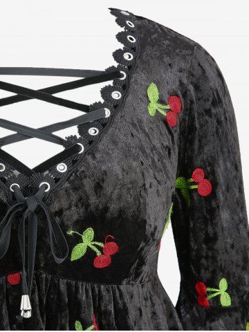 Gothic Plus Size Cherry Embroidery Grommet Lace Up Floral Lace Drawstring Flare Sleeve Top - Black - 3x | Us 22-24