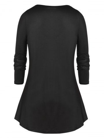 h*****y4Plus Size Ribbed Cutout Rivet Uneven Hem Tunic TeeColor: BLACK Size: 5XThis top is very comfortable if just a little too short. It is is a breathable fabric, fits well, and I love the cutout asymmetrical detail in front.