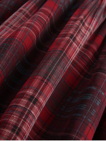 Gothic Plus Size Flare Sleeves Plaid Print Chain Ruched PU Strap Buckle Grommet Asymmetric Corset Blouse - Deep Red - L | Us 12