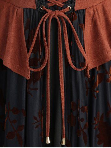 Gothic Plus Size Floral Jacquard Grommets Lace-up Lace Trim Flare Sleeves Asymmetrical Top